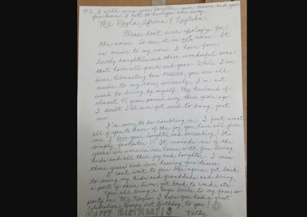 Młoda kobieta, w ramach przeprosin za głosne zachowanie podczas imprezy urodzinowej, napisała do swojej sąsiadki list.