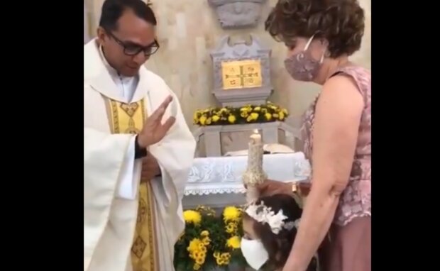 Dziewczynka jest przejęta i skoncentrowana na wszystkim, co robi ksiądz. Widać, że w momencie, dziewczynka jest nieco zmieszana i nie bardzo wie, jak powinna się w tej sytuacji zachować. I właśnie wtedy dochodzi do zaskakującego wydarzenia.