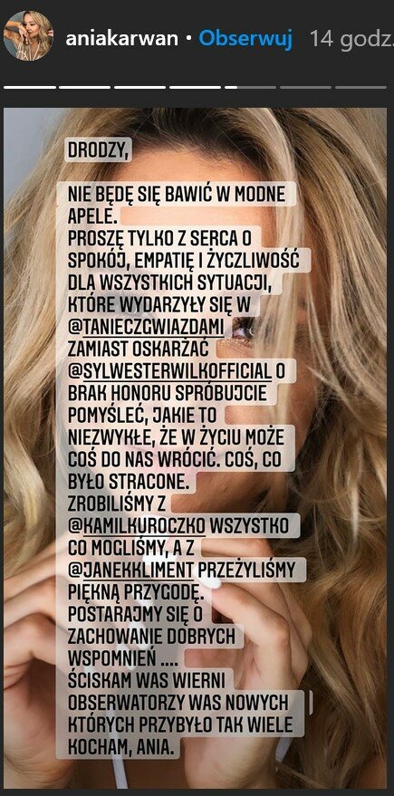 „Drodzy, nie będę się bawić w modne apele. Proszę tylko z serca o spokój, empatię i życzliwość dla wszystkich sytuacji, które wydarzyły się w "Tańcu z Gwiazdami". Zamiast oskarżać Sylwestra o brak honoru, spróbujcie pomyśleć, jakie to niezwykłe, że w życiu może coś do nas wrócić. Coś, co było stracone” – powiedziała w relacji na Instagramie, cytowana przez serwis Plotek.