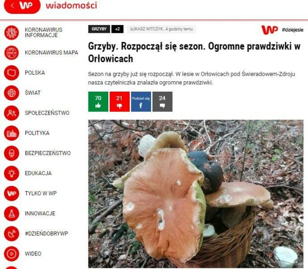 Czytelniczka portalu WP podzieliła się zdjęciami, na których widać okazy, które to kobieta znalazła podczas grzybobrania w Orłowicach pod Świeradowem-Zdroju. Dodała także, że to jedno z tych miejsc, które nie opuścimy z pustym koszykiem. Gdyby nie zdjęcia, trudno byłoby uwierzyć w wielkość okazów.
