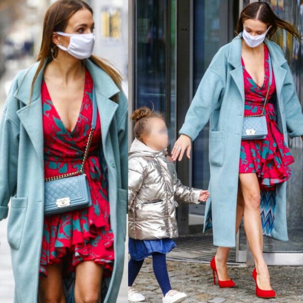 Gwiazda pojawiła się przed studiem "Dzień dobry TVN" w towarzystwie swojej starszej córki Kornelii. Wybrała na tę okazję bardzo letnią stylizację - krótką, zwiewną sukienkę z odsłoniętymi, gołymi nogami i głębokim dekoltem, czerwone szpilki oraz lekki, błękitny płaszczyk.