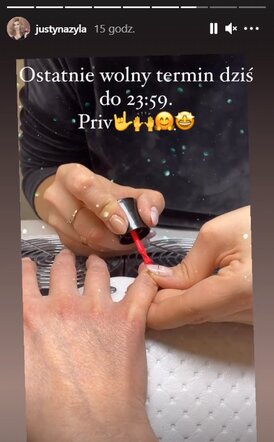 Opublikowała na InstaStories zdjęcie, na którym maluje komuś paznokcie i złożyła internautom "ofertę". Zadeklarowała się, że może wykonać usługi kosmetyczne, ale jedynie do godziny 23.59, czyli do momentu wejścia w życie obostrzeń.