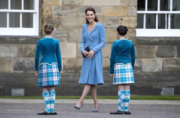 Na tę okazję Kate wybrała błękitną stylizację - imitującą płaszczyk sukienkę od Catherine Walker, szpilki o tym samym odcieniu, których koszt wynosi około 425 funtów oraz przykuwającą wzrok torebkę z granatowej, krokodylej skóry.