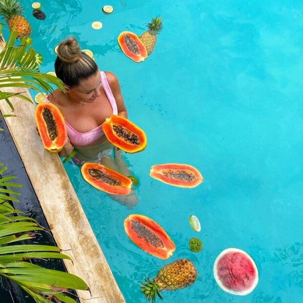 Rozenek odpowiedziała na oskarżenia fanów i zarzeka, że zjadła wszystkie widoczne na zdjęciu owoce. Sądzicie, że mówi prawdę? Uwaga jednego z internautów o chlorze w basenie jest chyba słuszna.