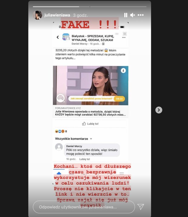 - Kochani… Ktoś od dłuższego czasu bezprawnie wykorzystuje mój wizerunek w celu oszukiwania ludzi! Proszę, nie klikajcie w ten link i nie wierzcie w to. Sprawą zajął się już mój prawnik – ostrzegła swoich fanów.