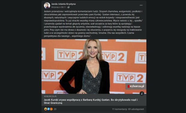 Na profilu Jandy na Facebooku pojawił się dość obszerny wpis. Gwiazda od razu zaznaczyła, że nie podoba się jej „krucjata prawdziwych mediów” wymierzona w Kurdej-Szatan, a emocje, które w dość nieparlamentarny sposób aktorka wyraziła w poście w sieci Janda nazywa „słusznymi, naturalnymi i zwyczajnie ludzkimi”.