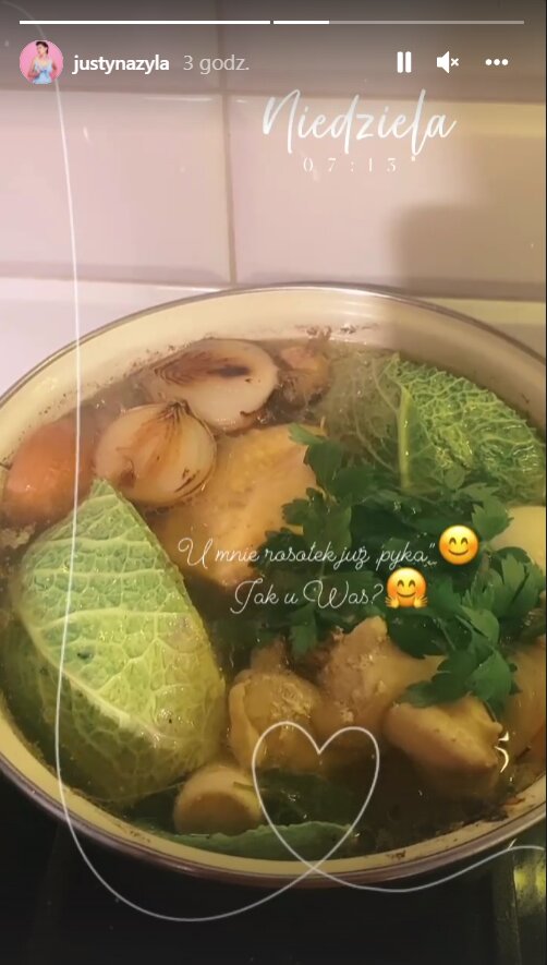 Nie da się ukryć, że Justyna Żyła ma talent kulinarny, gdyż często zamieszcza różne smakowicie wyglądające zdjęcia potraw. Dziś było podobnie – kobieta postanowiła przy niedzieli przygotować popularną, acz uwielbianą potrawę dla swojej rodziny - rosół! Wygląda apetycznie!