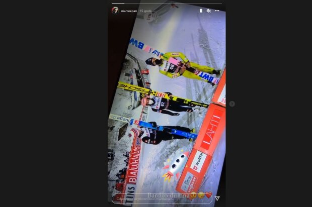 Wielki sukces Piotra Żyły nie przeszedł bez echa i na to, co udało się mu dokonać zareagowała Marcelina Ziętek. Aktorka udostępniła na InstaStory bardzo krótkie nagranie, na którym można zobaczyć fragment transmisji konkursu skoków.