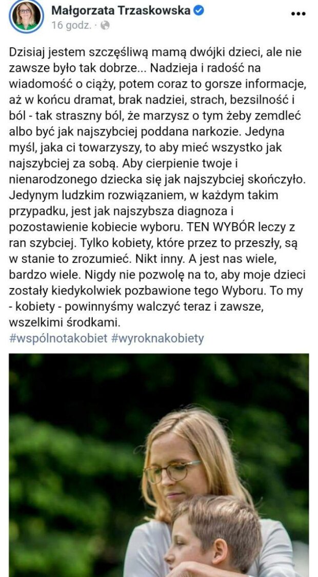 Na temat decyzji Trybunału Konstytucyjnego wypowiadają się niemal wszystkie kobiety, również znane, w kraju. Żona prezydenta Warszawy, Małgorzata Trzaskowska, umieściła na swoim profilu w mediach społecznościowych wstrząsający wpis, w którym pisała: