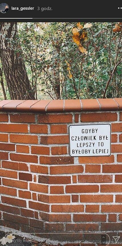 Podczas przechadzki świeżo upieczeni rodzice z zainteresowaniem oglądali pomniki, które znajdowały się w parku. Lara robiła też zdjęcia, jedno z nich umieściła nawet na swoim Instagramie – widać na nim tabliczkę przybitą do muru z napisem „Gdyby człowiek był lepszy, to byłoby lepiej”.