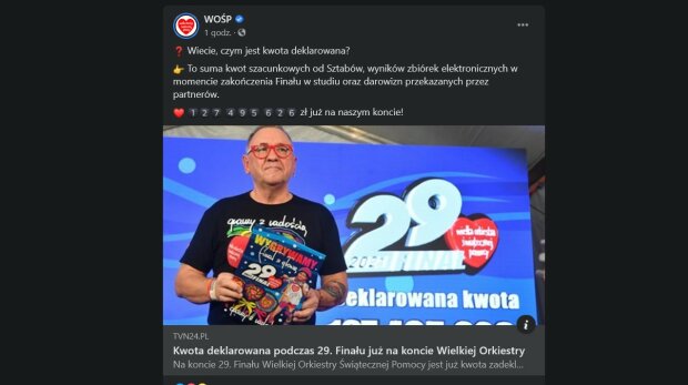 Fundacja Wielkiej Orkiestry Świątecznej Pomocy opublikowała w czwartek najnowszą informację na swojej stronie internetowej i w mediach społecznościowych dotyczącą wyniku 29. Finału WOŚP. Okazuje się, że na konto fundacji trafiło już 127 495 626 złotych. Jest to kwota deklarowana przez instytucję 31 stycznia, czyli pod koniec dnia 29. Finału.