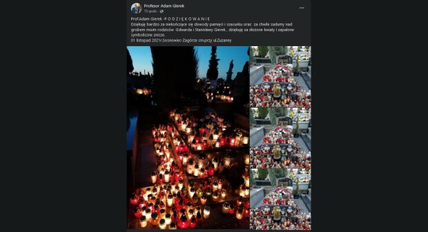 - Dziękuję bardzo za niekończące się dowody pamięci i szacunku oraz za chwile zadumy nad grobem moim rodziców – podziękował w sieci prof. Adam Gierek i zamieścił zdjęcie, na którym możemy zobaczyć grób Edwarda i Stanisławy Gierków pokryty szczelnie zniczami i wieloma światełkami.