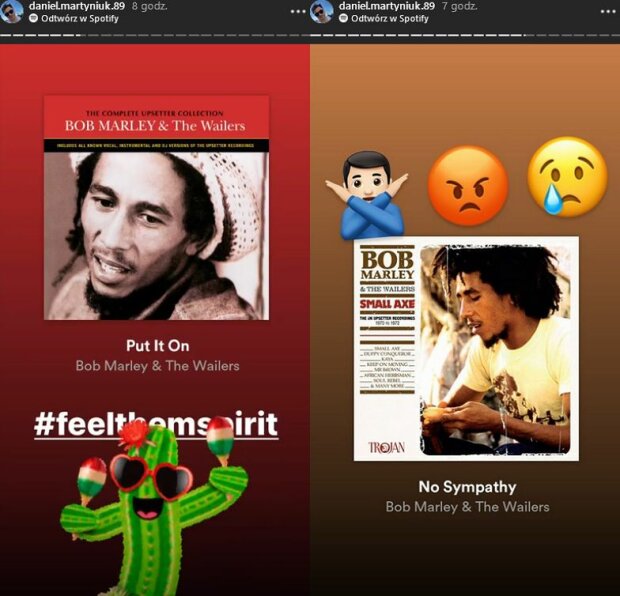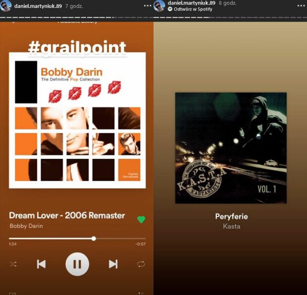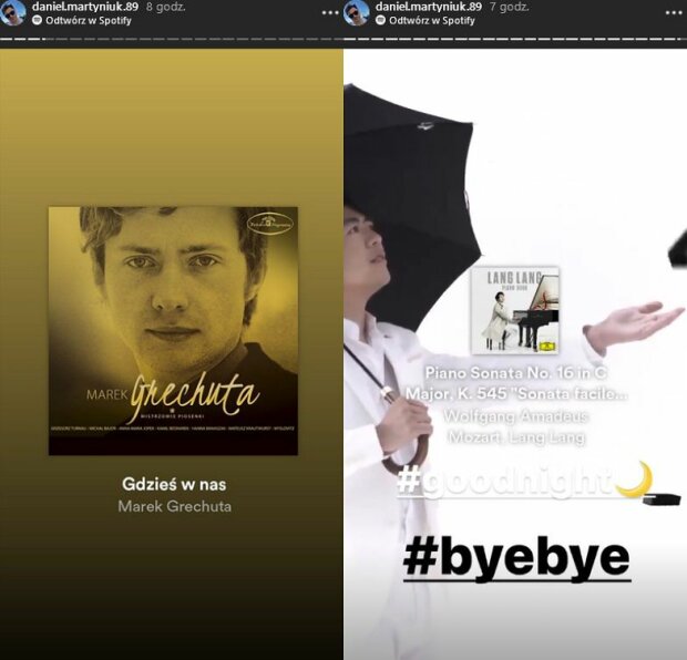 Na Instastories Martyniuka młodszego opublikowano koleje wiele relacji. Pewna cześć pokazuje jego muzyczne upodobania. Daniel uwielbia wiele gatunków muzycznych. Pomimo Boba Marleya, w którego "obronie" 31-latek stanął dosyć niedawno, przy szanse obwiniając Kamila Bednarka, pojawiło się również miejsce dla utworu hiphopowego zespołu K.A.S.T.A.
