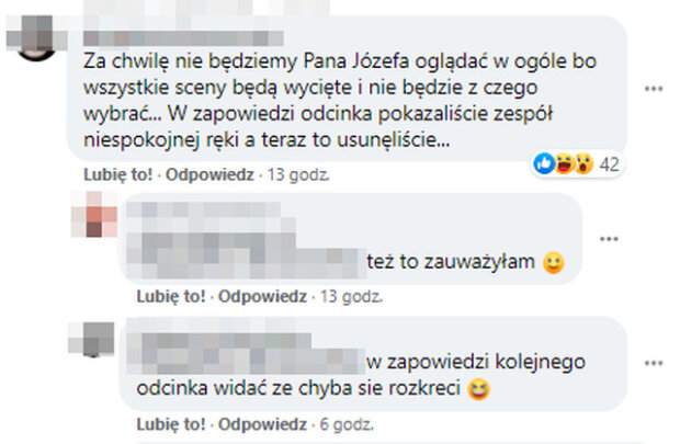 – Za chwilę nie będziemy Pana Józefa oglądać w ogóle, bo wszystkie sceny będą wycięte i nie będzie z czego wybrać… W zapowiedzi odcinka pokazaliście zespół niespokojnej ręki, a teraz to usunęliście… – czytamy w kolejnym.